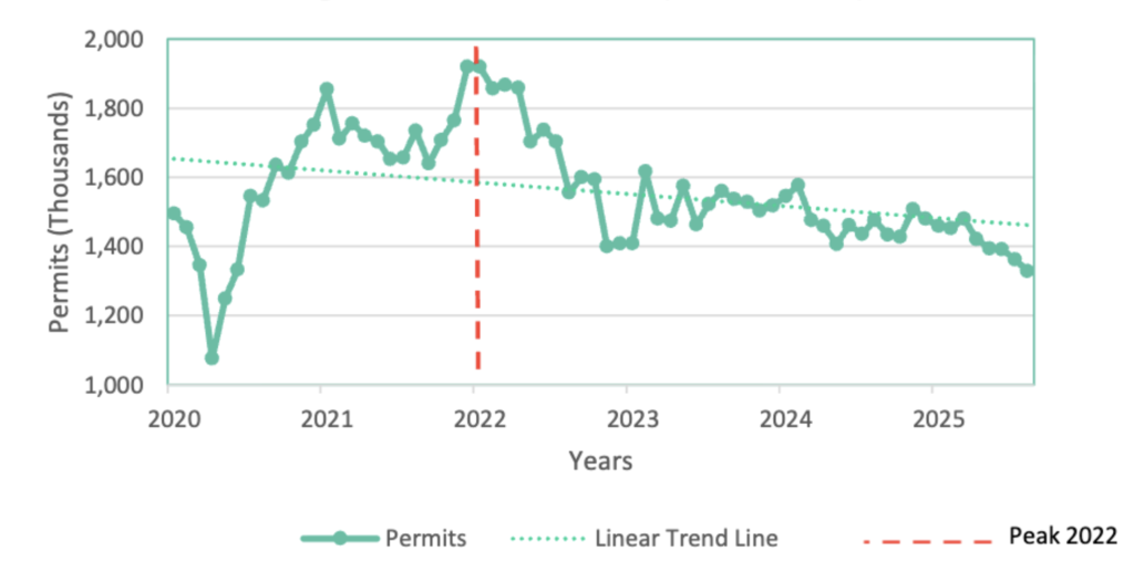 But by 2023, these domestic migration patterns had stabilized, and new housing permits declined (Frey, 2024; Jones, 2024). Modest gains in coastal urban centers had stabilized or reversed, and the housing gap in middle and sunbelt states continued to worsen. Adding to the strain, new household formation has steadily ticked up for three consecutive years, indicating that the factors that once encouraged adult children to stay in their parents’ home, or individuals to share rent with one or more roomates, are shifting. Moreover, by the summer of 2025, permits to build new apartment buildings dropped by 23% from the pandemic’s peak, single-family housing starts were down 6%, and permits for future single-family homes also declined by 2% (Katz, 2025; U.S. Census Bureau, 2025b).
